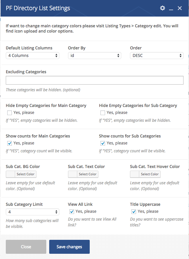 By using “PF Directory List” element which can easily be added through Visual Composer, you can create your category list that you have added to PointFinder. If you wish, you can filter listing categories or other taxonomies.